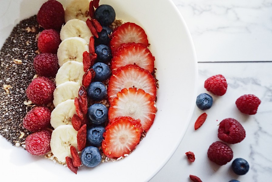 Müsli, Beeren und Superfoods in eine Schale geben, Mandelmilch mit Ovomaltine in einem Shaker mixen und über das Müsli geben.
