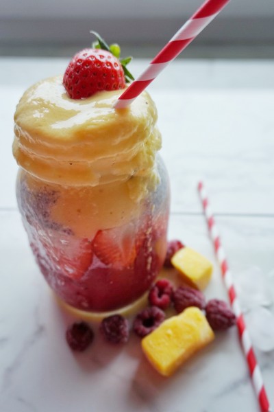 1.Schicht roter Smoothie │ 2.Schicht Chia Samenmilch │ 3.Schicht gelber Smoothie