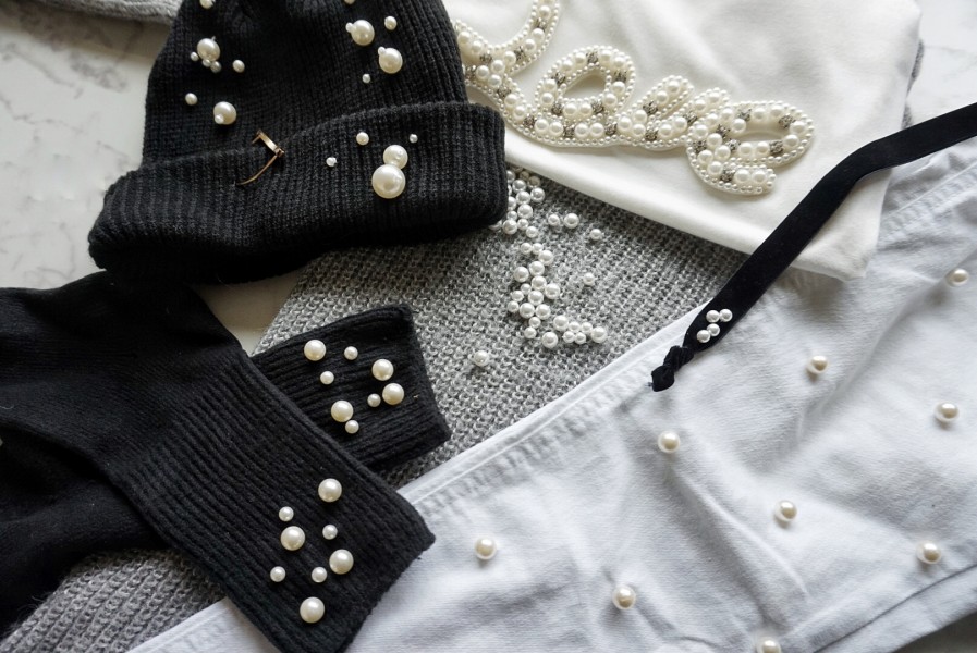 Dieses Mal habe ich mich mit Perlen ausgetobt. Überall wo man auch hinsieht, die schimmernden Kugeln sind in diesem Jahr nicht wegzudenken. Jacken, Hosen, Pullover und Accessoires wie Socken, Taschen und Mützen sind mit Perlen verziert.
