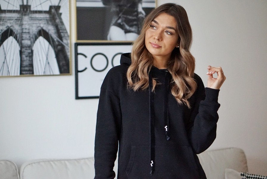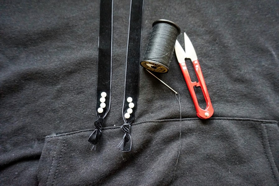 - Bei meinen H&M Hoodie habe ich mit Hilfe einer Sicherheitsnadel ein Samtband durch den Tunnelzug gezogen und an den Enden ein paar kleine Perlen angenäht. Anschließend habe ich die Samtbandenden geknotet.