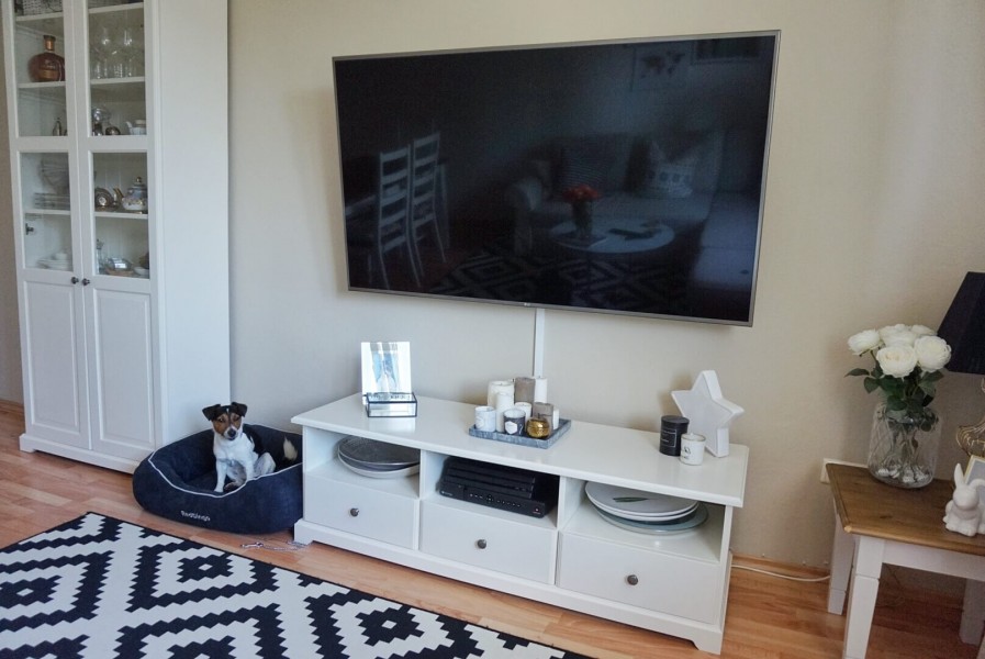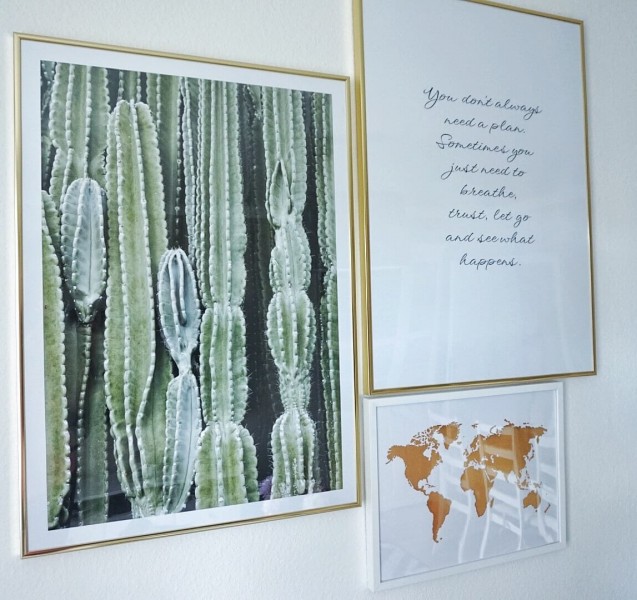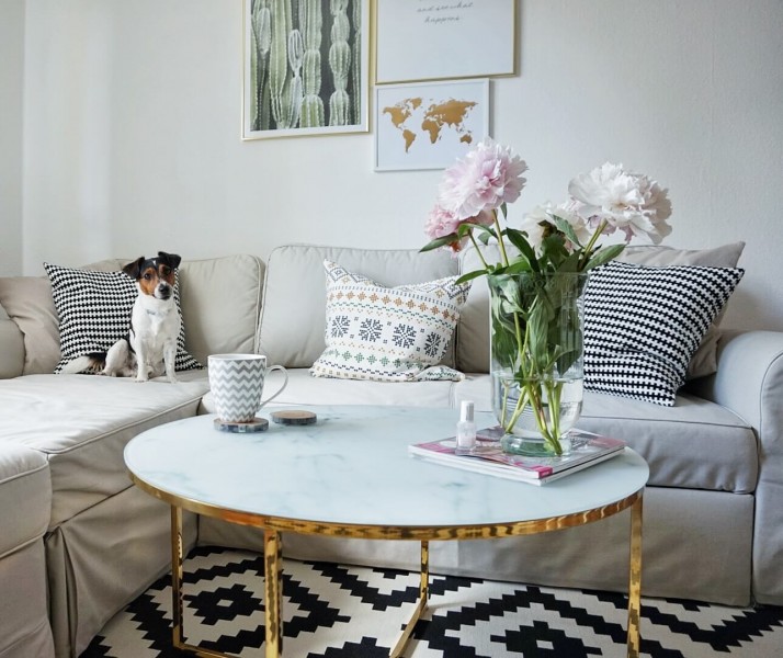Von unserem Landhausstil habe ich mich so langsam satt gesehen. Ein neuer Teppich mit skandinavischen Mustern brachte schon mal die Grundidee meiner Interior Vorstellung. Farblich zum Sofa und Teppich kombinierte ich Kissen im Mustermix. Auf dem Sideboard wird es gemütlich mit Kerzen in schwarz/weiß und Marmoroptik. Dezente Accessoires in gold brechen den starken Kontrast der Farben und geben den gewissen Glam. Auch sehr Glamourös und ein Schnäppchen ist die goldene Tischlampe mit schwarz/transparenten Schirm, die habe ich mir bei TK-maxx für 50€ ergattern können. Der aktuelle Hype geht an die Kakteen, die konnte ich zu dem Stil wunderbar einbringen. Einmal dezent auf der Fensterbank zu sehen und für die Wand fand ich auf desenio.com ein passendes Bild. Mein Highlight ist der Beistelltisch in Marmoroptik von westwing.de. „JA“ es wurde doch ein neues Möbelstück hinzugefügt, aber zu meiner Verteidigung! Wir hatten vorher keinen Beistelltisch, ich war immer auf der Suche nach dem Richtigen.