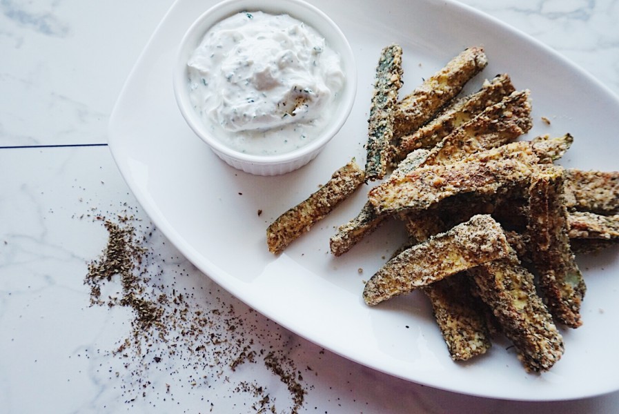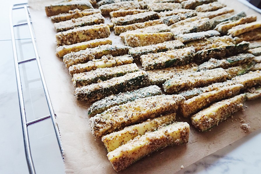 Ofen auf 180°C Umluft vorheizen. Backblech mit Backpapier belegen. Backpapier dünn mit Olivenöl bestreichen. Zucchini in dicke Streifen schneiden. Alle trockene Zutaten und Gewürze in einer großen Schüssel miteinander verrühren. Die Zucchinistreifen erst in die geschlagenen Eier geben, dann in der Parmesan-Mehl-Mischung von allen Seiten wenden. Die Zucchinistreifen auf das vorbereitete Blech mit etwas Abstand legen, ca.25 min. goldbraun backen. Zum Dippen passt sehr gut ein Kräuterquark.